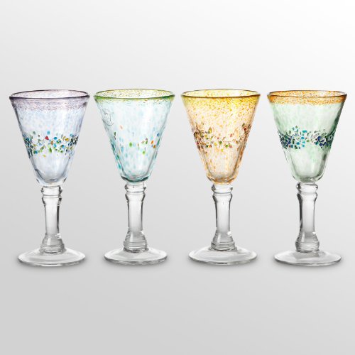 Amicis mouth blown hand made Sunrise Goblet features layers of color and glass beads embedded in the glass Glasses are made by hand then rolled in colorful glass for a spotted effect first on the body and then on the rim Finally each glass is dipped in colorful glass beads that form a band arou