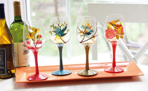 Birds perch amid brightly designed blooms feeling the warmth of the sun on their feathers enjoying the sounds and fragrances of the morning They are captured handsomely on these glasses above long blue orange red and green stems The Bird Study Stemware Glasses are so charming that they make an