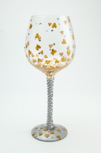 This generous larger than life design is an oversized wine glass 10 H 22 ozbedazzled with over 250 rhinestones and accented with a hand-painted golden hearts And the unique train case reveal-style gift box makes this fabulous super bling glass perfect for any and every occasion Lolita